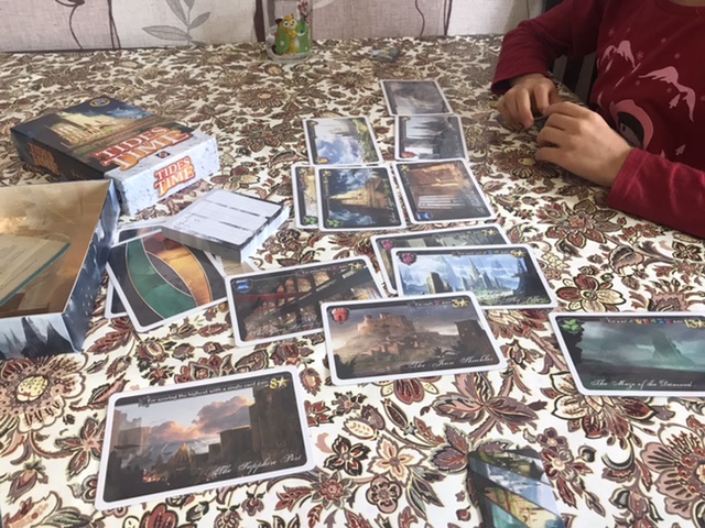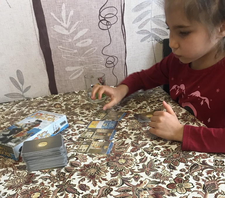 Сегодня мне повезло чуть больше, но нельзя сказать, что я придерживалась какой-то выигрышной стратегии, просто мои комбинации карт сработали чуть лучше. Дочке приходится запоминать значения карт, так как все надписи на английском, несмотря на это, игра достаётся с завидным постоянством, может это заслуга потрясающих иллюстраций.