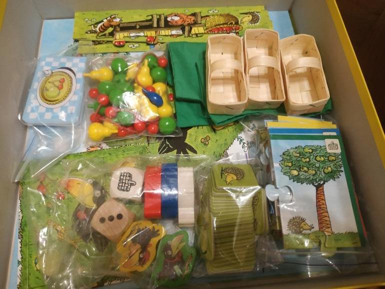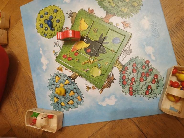 Купили мы её давно. Сначала средний играл с удовольствием, а потом то ли поостыл, то ли переиграл, то ли мы ее слишком далеко положили. Но сегодня играли полным составом. Даже старший принял участие, еле уговорили, правда старался ворону на кубике выкидывать, чтобы поскорее сбежать от нас. Вот какая красота внутри коробочки