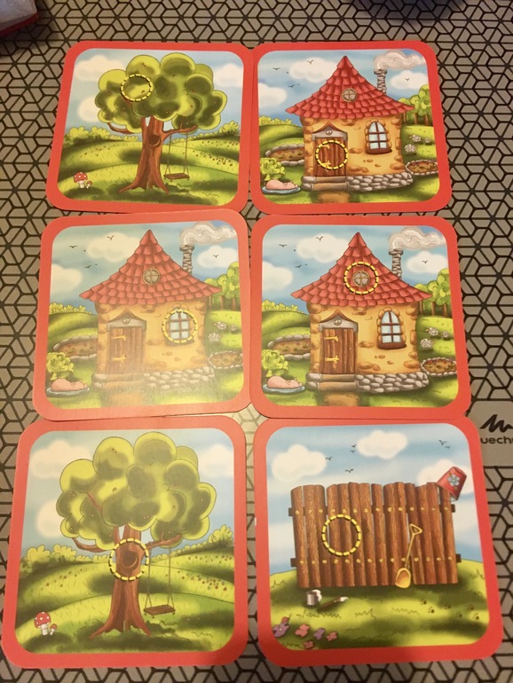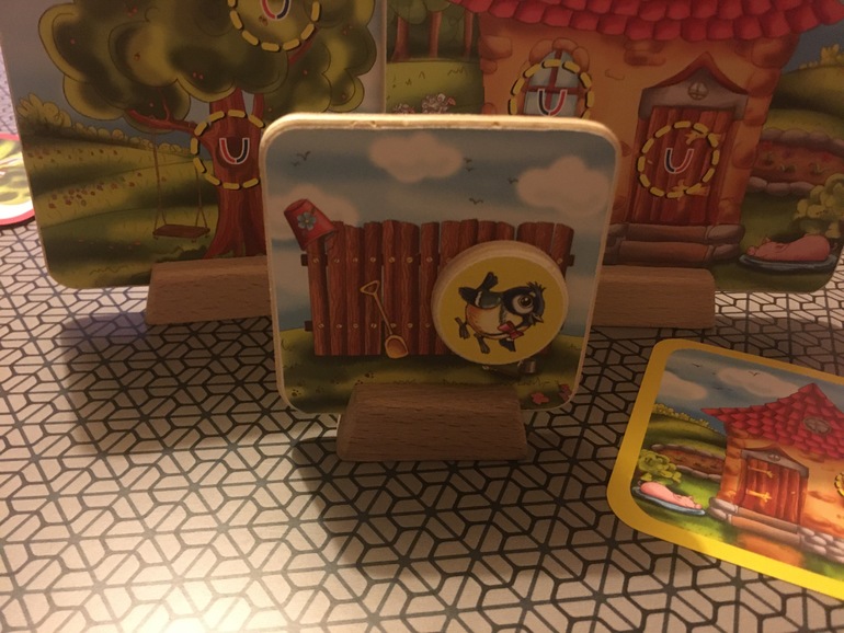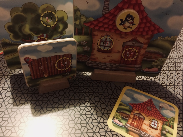 В игре три деревянные зоны: домик, дерево и забор. На домике три отмеченных кружочками места: окошко, дверь и чердак, на дереве- два: дупло и ветки, на заборе- один. Каждому игроку в начале игры выдаётся набор карточек, на каждой из которых отмечена одна из зон, например, окошко в домике или дверь в домике, или дупло и т.д.