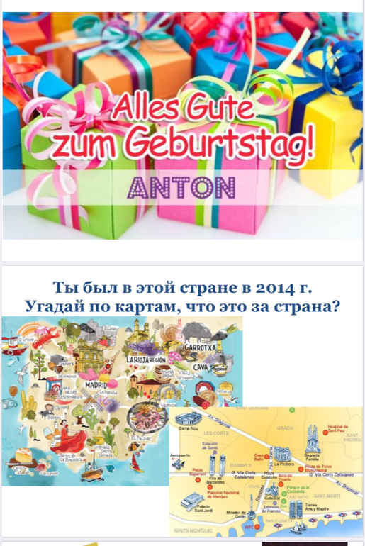 После угадывания каждой страны или материка был слайд с фразой «С днём рождения, Антон!» на языке этой страны или одного из распространённых на материке языка.