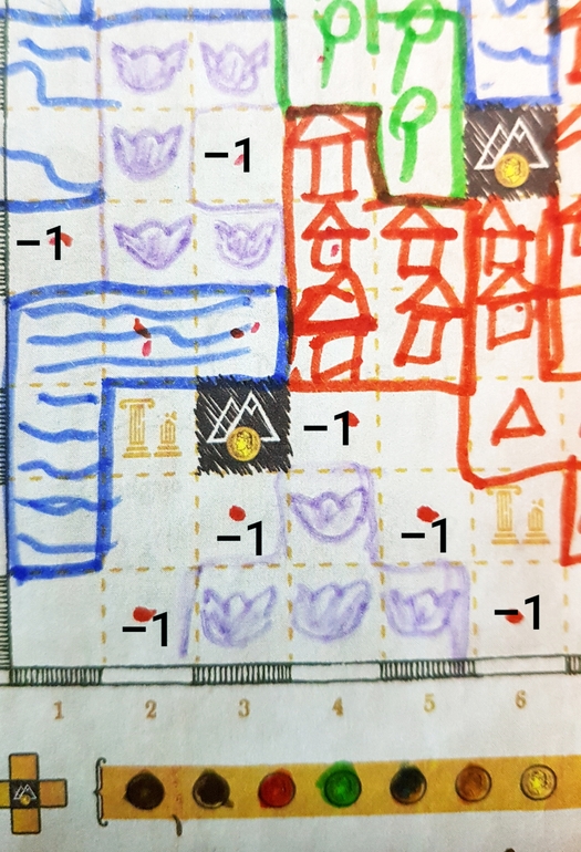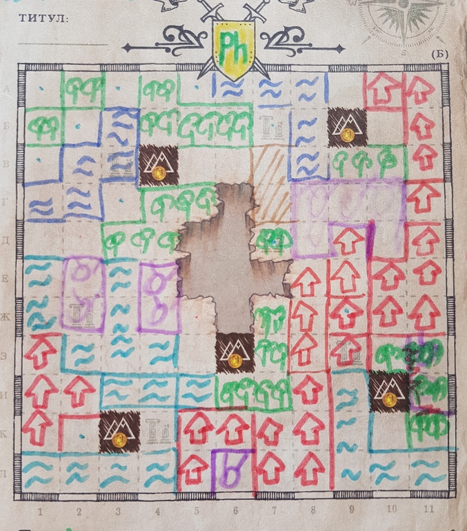 Так вот, злые народцы нападают неожиданно (при выходе такой карты соперник рисует на моем планшете фигуру, указанную на карте), и тут важно разведать местность вокруг, чтобы избежать встречи с ними в будущем (за каждую пустую клетку, смежную с фигурой монстра, при подсчете ПО вычитаем одно очко, причем в каждом раунде. Поэтому нужно заполнять пространство вокруг них).