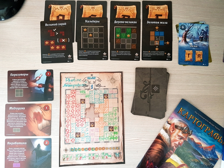 В Картографов можно играть и соло. Процесс почти такой же, исключение - карты монстров, которые должны быть размещены определенным образом. Цель - просто набрать как можно больше очков.