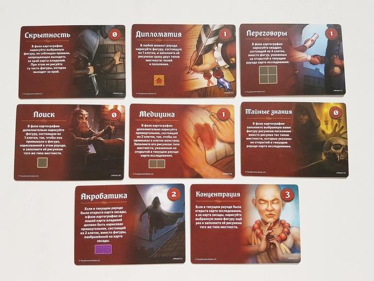 К примеру, карта Акробатика стоит 2 монеты и обязывает соперника нарисовать на моем планшете вместо открывшейся фигуры монстра всего лишь маленький прямоугольник. Его легче окружить.