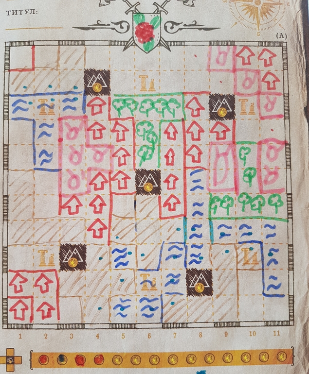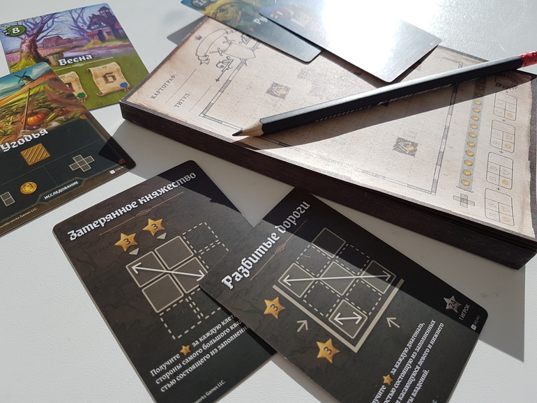 В коробку с игрой издательство положило 4 неплохих простых карандаша (в Солнечной долине были гораздо хуже ). Но мы их не используем вообще. Намного интереснее создавать цветную карту с помощью фломастеров. Это добавляет атмосферности.