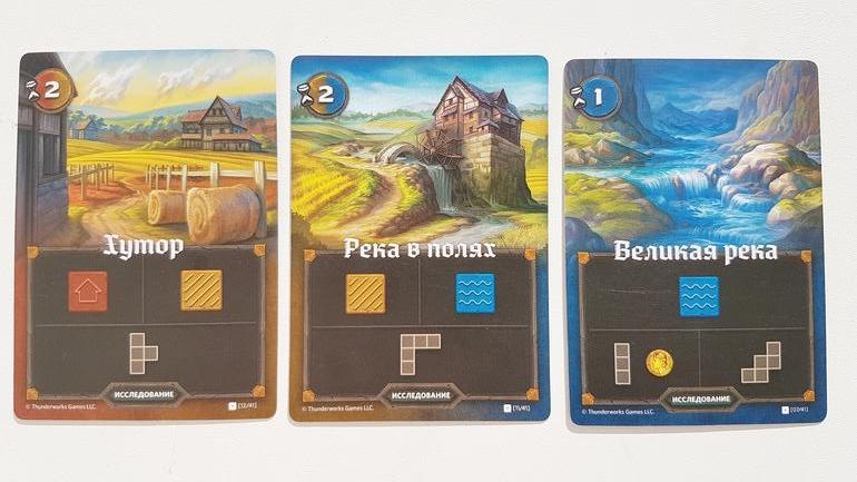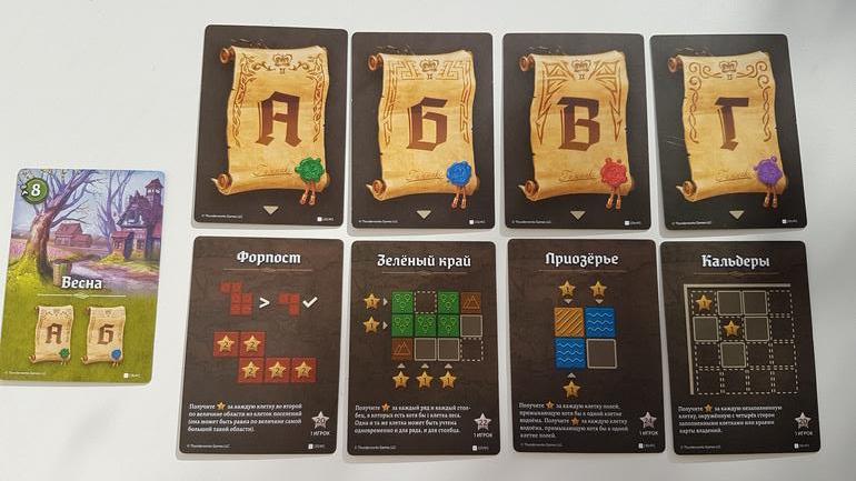 Если совсем коротко: в игре 4 раунда - 4 сезона. В каждом сезоне очки начисляются по-разному. За что вообще они будут начисляться, зависит от открытых перед началом партии карт целей. Например, весной (1-й раунд) нужно выполнять условия А и Б, то есть строить поселения, причем очки принесет второе по величине, значит надо создать их минимум два, и не слишком мелкие. А также очки принесет лес, после окончания раунда будем проверять количество строк и столбцов, в которых на наших картах есть лес.