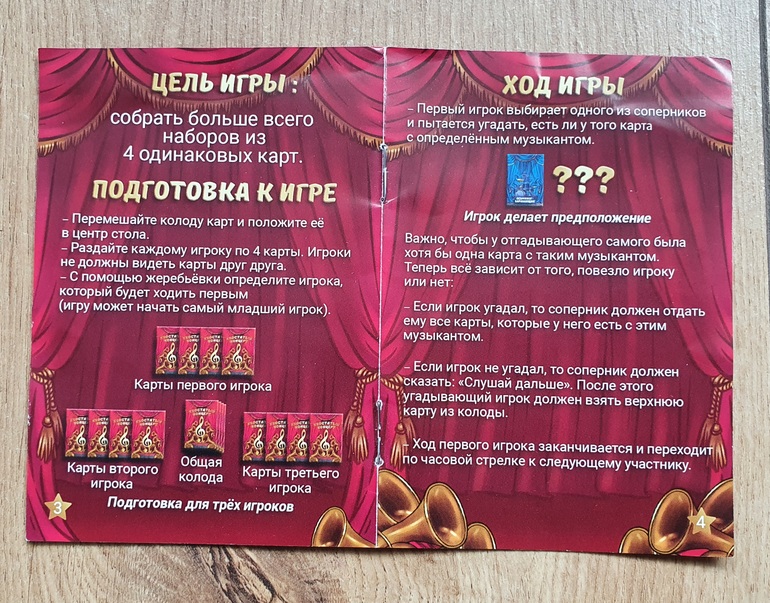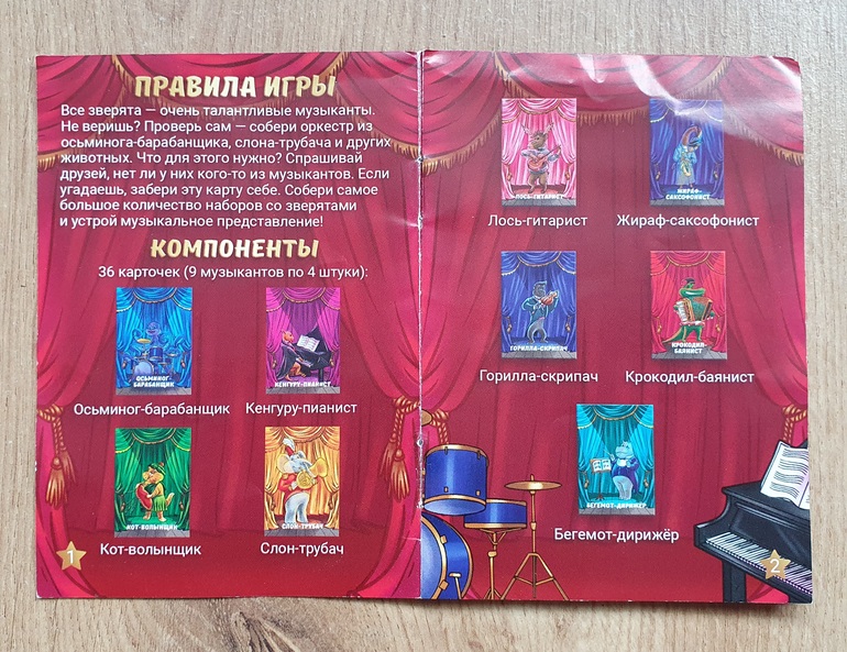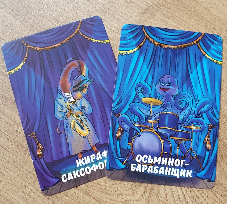Производитель Konig game (он же "Рыжий кот"). Карточки из тонкого картона, но сделаны очень качественно. Если относиться к ним гуманно, прослужат долго. Иллюстрации мультяшные, нам они кажутся вполне симпатичными. Цвета чуть более яркие, чем я люблю, но для "концертной" тематики это уместно.