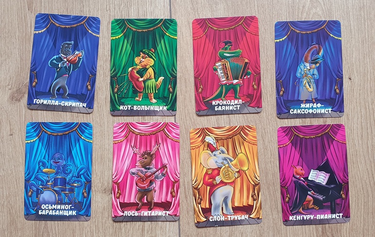 Перед началом выкладываю перед каждым игроком по восемь карт с изображениями животных, играющих на разных музыкальных инструментах.