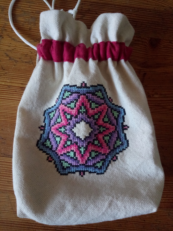 И совсем напоследок, ещё один мешочек, самый классный. Вышивала и шила его для какой-нибудь настолки, в результате, подарила маме))))