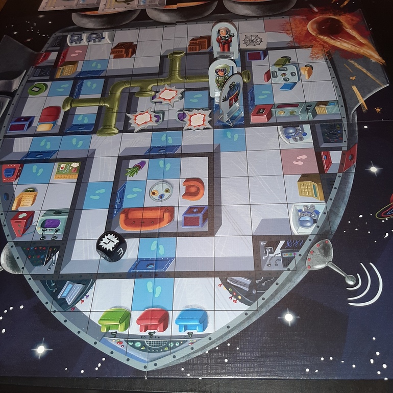 Это одна из тех игр, где Господин Рандом правит почти всегда в пользу детей. Я хотела быстренько выполнить родительский долг, но не тут-то было! На столе развернулся настоящий триллер. Пришелец истребил двух моих космонавтов и нацелился на двух остальных, но тут вдруг случилось невероятное везение. У меня выпало 6, и Виктория-инженер смогла улететь на спасательной капсуле в другую часть корабля. Марк уничтожил паутины и яйца. Пришелец сломал анабиозные камеры и пытался спастись бегством, но... не удалось.