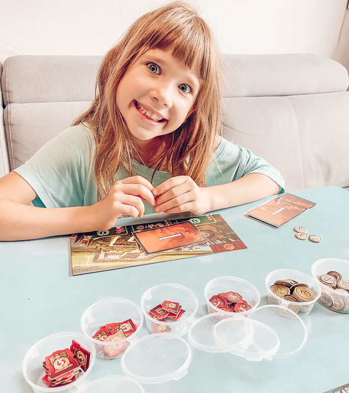 И вот уже вечером я позвала старшую дочь играть в Роскошь снова. Думала устроить мягкую партию, чтобы дать возможность ей победить. Не поддаваться, но и играть не агрессивно, без особой стратегии. Младшая после такой нашей утренней эмоциональной игры тоже захотела присоединиться. А старшая захотела снова играть с папой 🙈. В общем я сразу поняла, что отыграться у дочки не получится. Папа не станет играть по-детски. Ему так не интересно и скучно и я его понимаю. Поэтому сели вчетвером играть без поддавков).