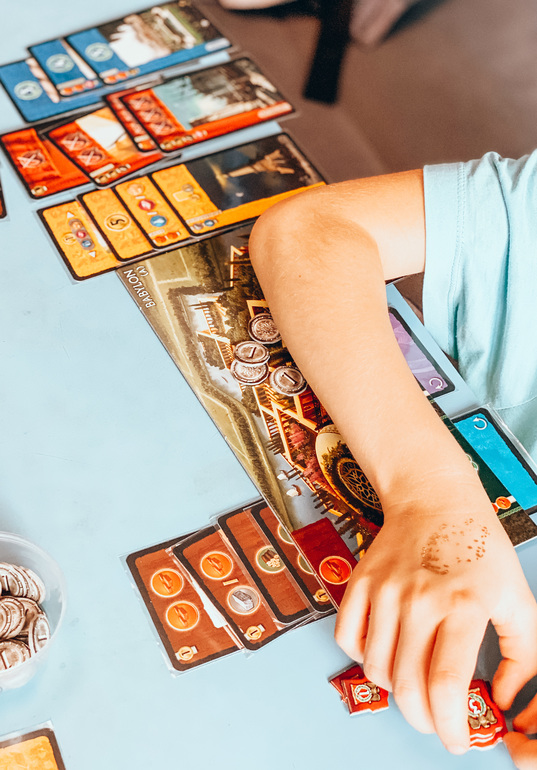 Старшая дочь в первых двух эпохах набрала чересчур много ресурсов и мало карт, позволяющих получать победные очки, плохо у неё получается рассчитывать, какая карта с руки принесёт ее больше всего очков.