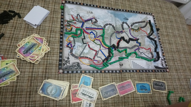 Потом играли в Ссср. Но я накосячила с распечаткой поля, получилось оно меньше, вагончики не входят, не удобно, надо переделать. Но карта России или СССР нужна нам точно, классно ведь ездить по знакомым городам