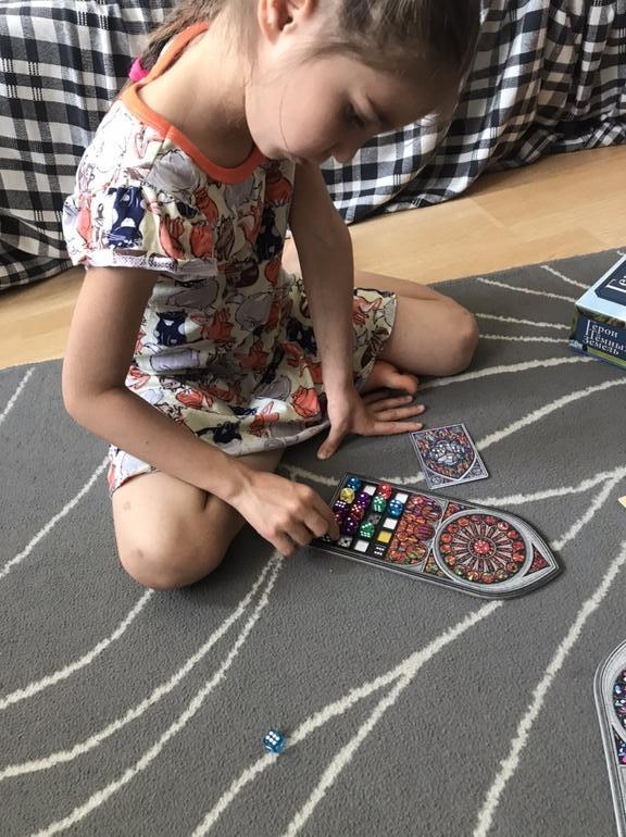 Пару раз пришлось подсказать, чтобы она не размещала кубики так, чтобы блокировать себе дальнейшие действия, но для первого раза быстро поняла что к чему. На мой вопрос что ей больше понравилось Азул или Саграда, дочь сказала, что они обе ей нравятся одинаково).