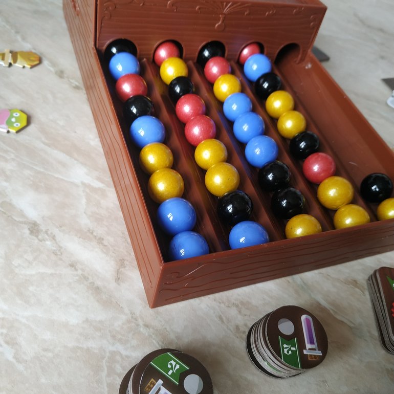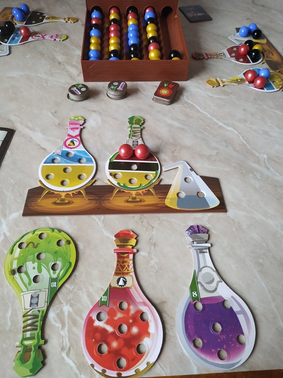 Как же долго она нас ждала))) Отличная семейная игра. Играли пока только втроем, интересно как она на четверых. В нее даже проигрывать не обидно, потому что процесс игры затмевает осадок от проигрыша. Эти шарики, колбочки, зелья и их свойства, это же все такое красивенькое!!! Кстати быстро выучили свойства зелий благодаря подсказкам на колбах. Игра заняла достойное место на полке у детей в комнате.