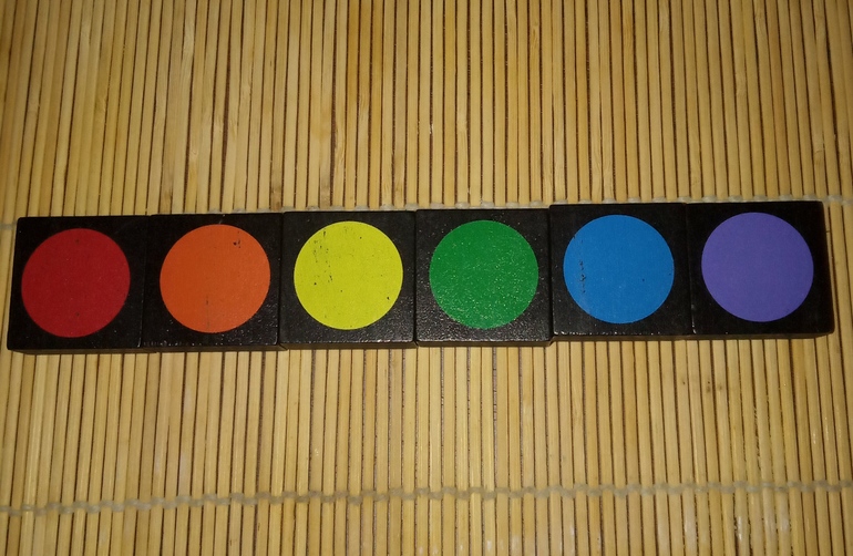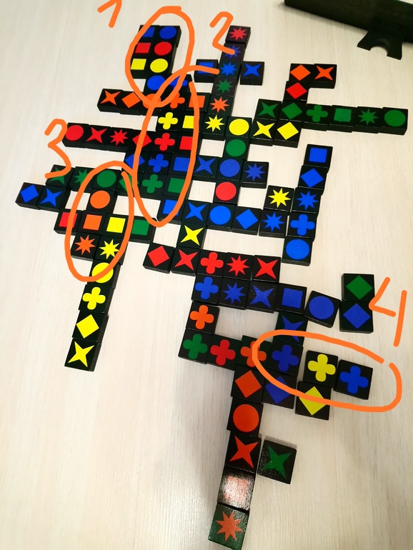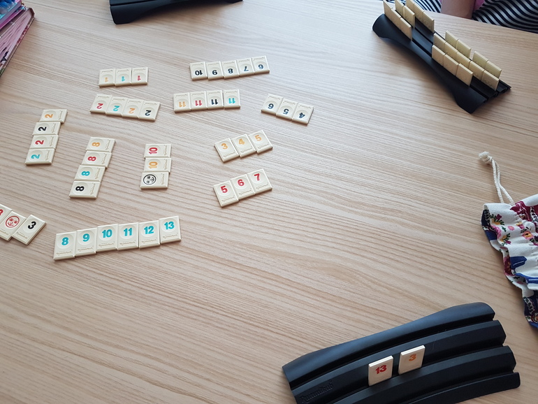 На четверых он мне больше нравится, чем на двоих. Сегодня вышла очень необычная партия. Сначала несколько кругов я не могла войти в игру, пропускала ход и брала фишки. Потом наконец присоединилась к играющим и за ход выложила почти все свои фишки, в том числе те, которые набрала. Осталось две (на фото). И в следующий ход я выложила эти две и выиграла. Вот такая короткая партия получилась. Я сделала только 2 хода.