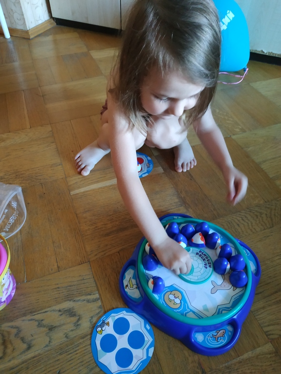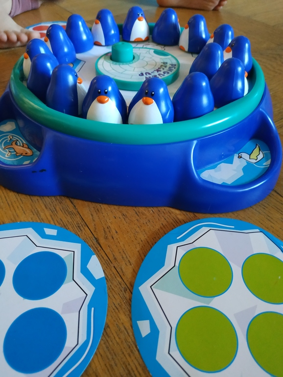 Наконец-то дочка поняла, что надо за моими руками следить. Играли и просто на скорость, кто быстрее пингвинов своего цвета найдет. И по очереди. Словил своего пингвина, садишь его на свою льдину, не словил, ход переходит к следующему игроку.