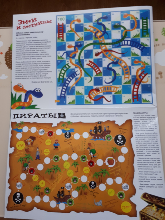 На обратной стороне поля Веселого путешествия есть еще 2 ходилки, Змеи и лестницы и Пираты. Змеи и лестницы нам с дочкой понравились, а Пираты не очень.