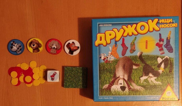 ▶️Дружок ищи носок - купленая за смешные деньги в свое время в магазине Фамилия игра оказалась очень интересной. На игре указан возраст 5+, но мы играем с 2 лет. Для 7 лет она например очень лёгкая. Играем по своим хоумрулам. Уже наверное придумали их к этой игре несколько вариантов. Смысл игры в том, что вашей собаке необходимо найти выпавший на кубике носок. Игра идёт в закрытую. Сначала ставим собачек на газон, где предполагаем нужный носок и как всё определяются проверяем. Чья собачка угадала приносит хозяину фишку. В оригинальных правилах это не только мемори, но и игра на скорость. Чья собака первой встала на нужный квадратик получает больше фишек, а кто не отгадал отдает фишки. Но пока мы так не играем. Младшему очень тяжело расстаться с заработанными фишками.