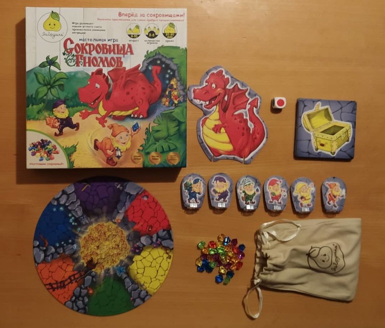 Игра с простыми правилами и замечательными компонентами. Особенно дети в восторге от драгоценных камушков. В игре гномикам необходимо утащить сокровища из пещеры Дракона.