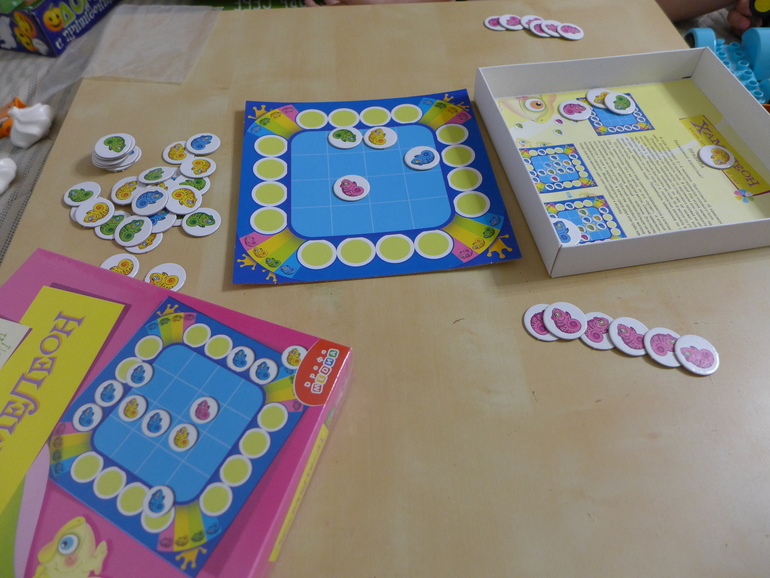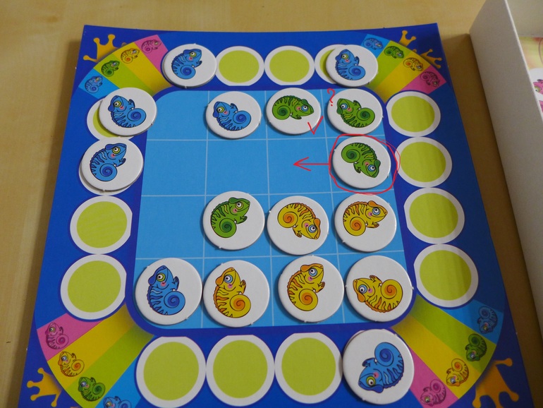 На Хамелеонах уже проснулся сын. Ему во все игры хочется с нами, а не во все получается, в дуэльные как ни крути - не сообразить на троих)) Поэтому пришлось между играми делать перерыв на чтение небольших книжечек, чтобы все остались довольными. Тут мы вышли с ничьей. Так как статистику побед не веду, не могу сказать, кто чаще выигрывает. Часто замечаю за дочкой её небольшие просчёты по выгодному передвижению хамелеонов. Но думаю, что это вопрос времени - шашки она любит, и эти разноцветные рептилии ей тоже нравятся, значит и опыт придёт. Тут у меня тоже вопрос к тем, у кого есть эта коробочка и кто наиграл в него не один десяток. Если зелёный хамелеон переместится по стрелочке влево, он точно испугает собрата над собой. А вот диагонального справа - может? Мы для себя выбрали решение, что нет. Но может мы не правы. P.S. На фото уже окончание игры.