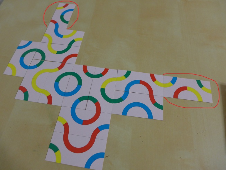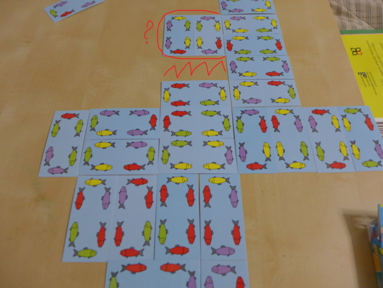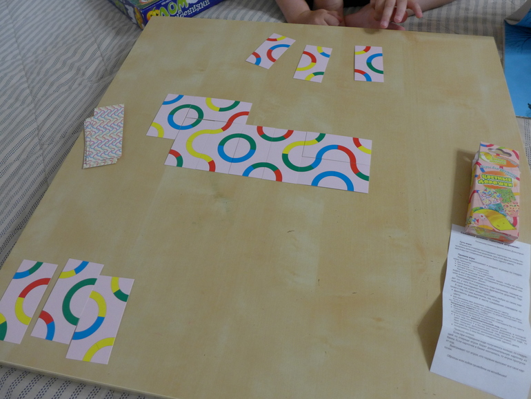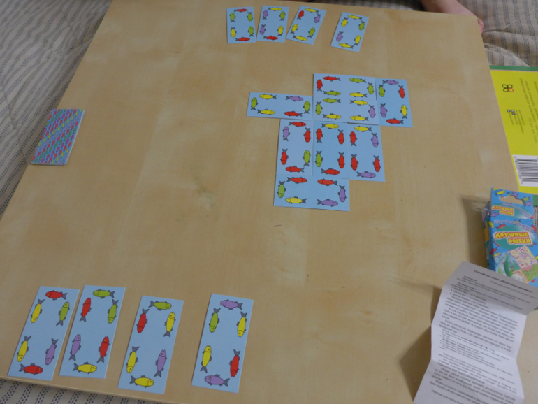 После дочь вспомнила про самые маленькие коробочки в нашей игротеке. Удивило меня скорее то, что дочь предложила именно Цветные дорожки, в первую партию весной они мне показались сложнее Дружных рыбок. И хотя дочь достаточно внимательна в играх, в последней всё же может не заметить пару рыбок, предлагаю замедлится и ещё раз проверить или подсказываю цвета, на которые ей стоит обратить внимание. В рыбок мне даже удалось выиграть. И тут у меня будут вопросы у знатоков - могут ли отмеченные красным карточки так лежать?