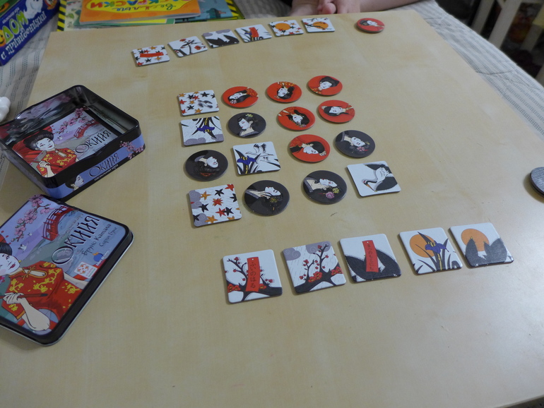 Окийя, любовь моя. А теперь ещё и игра с историей. Коробка сильно помялась - на неё упала навесная секция шкафа 😱(не только на неё конечно, ещё мемори пострадали и всякое по мелочи вокруг, но из игр отделались только двумя инвалидами, хотя под этой секцией собраны сейчас почти все наши коробки). Муж выровнял, как смог, но назвать её красоткой нельзя)) Составляющие не пострадали. Играем больше по моим просьбам, но дочь не отказывается. Может потому, что последние партии я как-то глупо проигрываю, а она выигрывает под мои удивлённые глаза - "Как так, где моя ошибка? Вооооот, ёлки зелёные!", а дочь заливается смехом и кладёт свою последнюю фишку. Хочется играть и играть ещё. А ещё хочется с кем-то из взрослых попробовать. Но мои дети редко когда повторно играют в тут же игру, чаще приносят другие коробки.