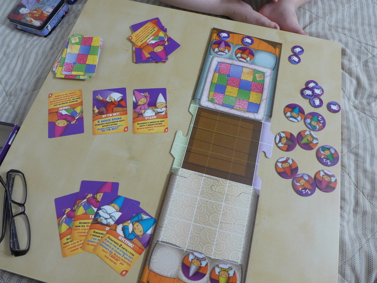 При игре в Моё одеяло сын у нас отвечает какое-то время за раздачу и изъятие гномов, в конце - за овец. Но хватает его не на долго, сливается заниматься своими делами)) Игра состоит из трёх раундов, первый мы с дочкой отыграли быстро, выиграла дочь. Второй затянулся, но путём нехитрых (хотя порой провальных) манипуляций с картами я вышла победителем. Было уже сильно поздно, решили третий раунд перенести на сегодня. Заметила, что ещё не владею полностью правилами, играю вполсилы, применяю не все карты, иногда пропускаю губительные для себя ходы от дочки (хотя могу и отменять их). Решила отслеживать это специально и учиться задействовать все имеющиеся в руках карты по возможности. В целом игра нам нравится, но буду повторять каждый раз - не считаю её обязательной к покупке.