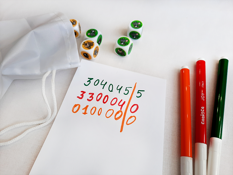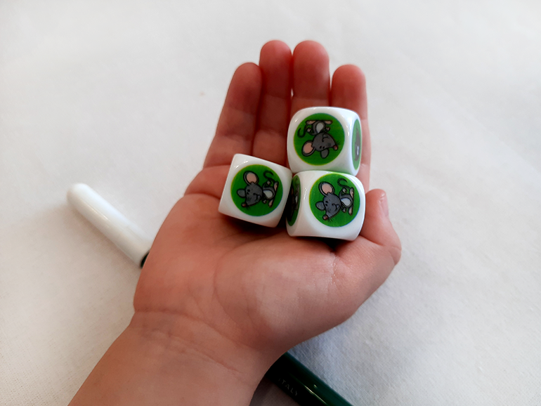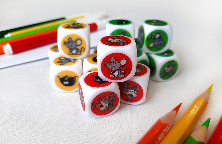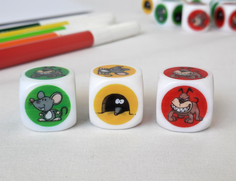 Мышки и собаки остаются, а норки можно перебросить, добрав из мешочка до трех кубиков. Количество попыток бросков не ограничено, но если наберется три собаки, все мышки разбегутся и победных очков в этом раунде не достанется. Если игрок решит остановиться, то количество мышек записывает в победные очки, а кубики закидывает в мешочек и передает следующему.