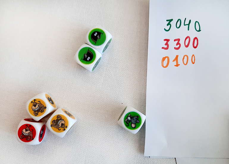 Мы играем за котов. Коты вышли на охоту за мышками. На зеленых кубиках много мышей, и поймать их легко. На желтых мышей столько же, сколько и собак. А вот на красных кубиках всех мышей разогнали собаки.