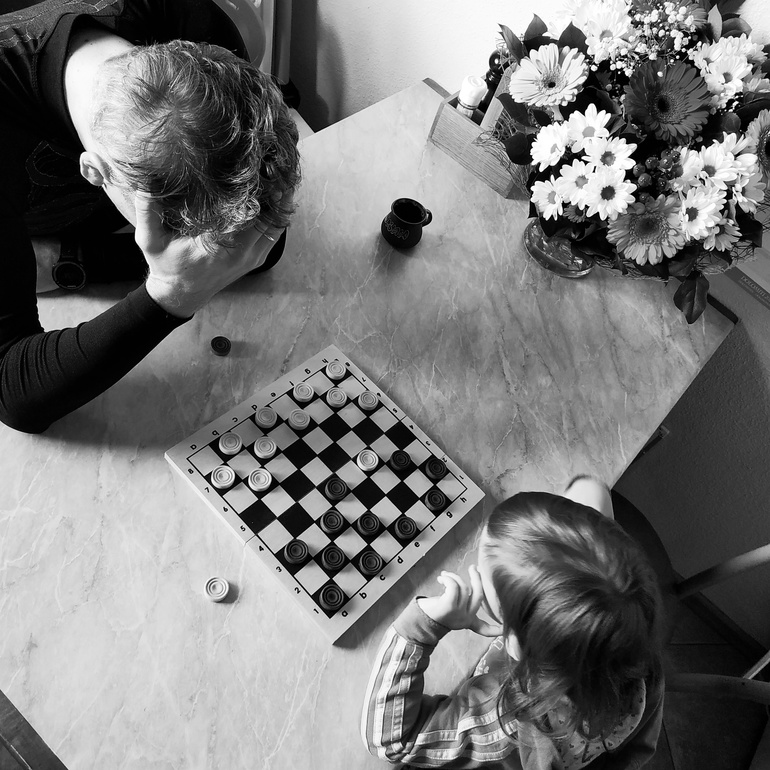 Он обожает шахматы, а я совсем не люблю и играю очень плохо. А в шашки сын меня обыграть не может, но я очень хорошо играю и принципиально не поддаюсь.