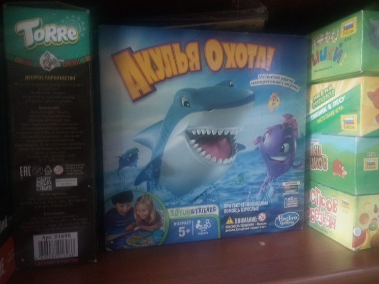 Итак, я хотел вообще-то о другом рассказать. Сегодня справляли день родов супруги первым ребенком. Эти дни почему-то приписывают детям и дарят им подарки, хотя в чем их заслуга, еще не доказано. Но тем не менее, были конкурсы на дому, подарки, все дела. При подготовке супруга сказала: на твои настолки времени и не будет, наверное. Намек понял, принял. И готовиться не стал. И тут, во время очередного забега через мой кабинет один боец остановился и потребовал сыграть в Акулу. Ну, ок.