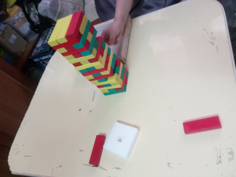 Ну, тут тоже забавно - вроде всемирно известная игра, но и тут нашлись новички. Тем не менее одну башню мы почти разобрали, оставив в каждом ряду по одному бруску. Жаль стол неустойчивый …..