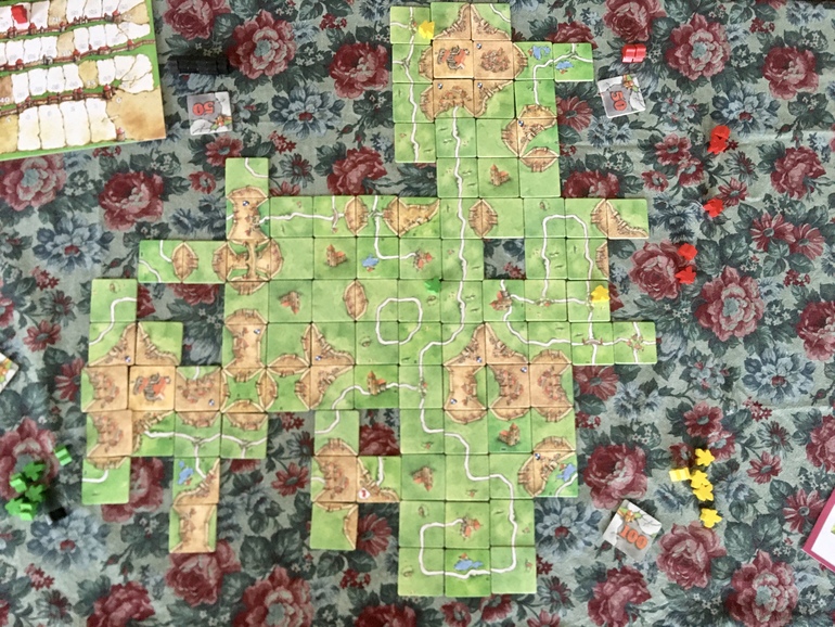 Я сразу достала коробку и мы вчетвером со взрослыми детьми приступили к строительству местности. Я не старалась победить, играла скорее из любопытства и чтобы поддержать компанию. Использовали почти все тайлы из дополнений Королевский подарок. Мальчик играл прекрасно, шикарные и нужные тайлы так и шли к нему в руку, он и выиграла с огромным отрывом. Появление мальчика , ровесника девочек , в компании , не могло пройти незаметным. Коллектив преобразился, дети шутили, обсуждали каждый ход, везучесть одних или, наоборот, бесконечные тайлы с дорогами, попадавшиеся другим. Ещё никогда партия в Каркассон не была у нас такой живой, веселой и смешной. Наши гости очень хотели выиграть, девочка ужасно переживала, хоть и старалась не подавать виду. И лишь моя дочка просто играла без всяких видов на победу. Она даже помогала своим товарищам, достраивая им города или дороги. В итоге, заняла четвёртое место и даже бровью не повела.