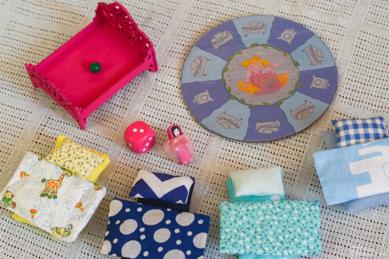 почти 3500 р. Цена совсем мне не понравилась, а игра засела у меня в голове, поэтому я снова уселась за графический редактор и швейную машинку. Уж очень главная героиня похожа на нашу подружку. ама игра состоит из картонного основания кровати, 4 комплектов постельных принадлежностей (матрас, одеяло и подушка), горошины, двустороннего поля, фигурки принцессы и кубика. Правила игры можно прочитать, нажав на фото.