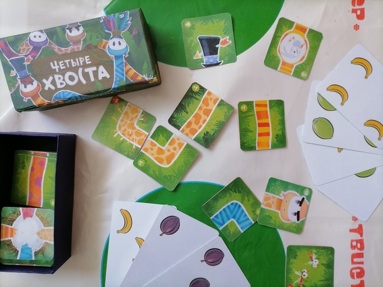 Четыре хвоста можно было бы и раньше предложить, да я затянула с её изготовлением. Очень простая, незатейливая игра, которая при этом очень полюбилась дочке. Сидишь себе да выкладываешь карточки, причём большинство их предназначено исключительно подходящим по цвету питонам. Так что все выращивают всех))) Правила не сразу поняли полностью, и не могли толком разобраться, где конец игры уже, дочь всё порывалась выложить голову скорее.