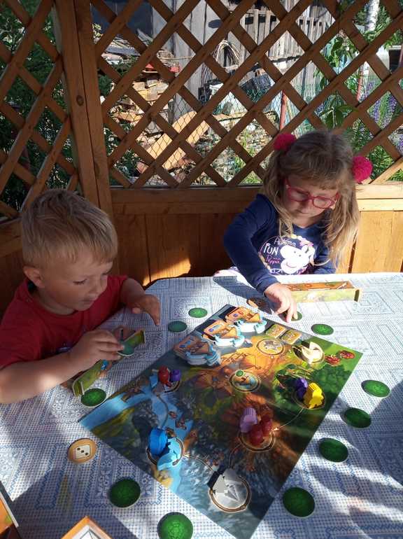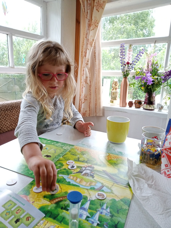 Дочка потом сама предложила научить брата. Я ее честно предупредила, что может не получиться. На самом деле правила он вполне бы понял, там ничего сложного, но вот только соблюдать правила у него не было не малейшего желания. Поигрался компонентами. А мы с дочкой вдвоем доиграли. Она сказала :