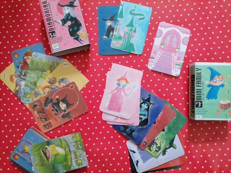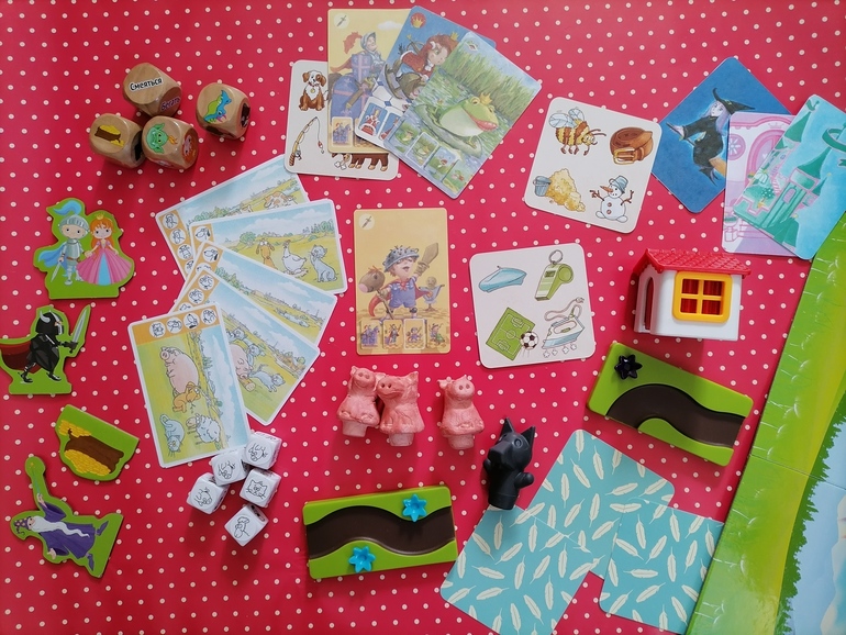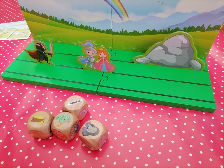 На волне марафона мы решили дать игре новый шанс, и не зря. Я донесла до дочки, что сказка может быть сколь угодно абсурдной, и это игра для удовольствия, а не для построения складного логичного рассказа. Дело пошло! Мы сыграли уже несколько партий, и игровой процесс теперь радует всех. Теперь хочется добавить немного своих персонажей и кубиков, а ещё я увидела идею, что компоненты игры удобно использовать для развивающей игры на развитие понимания пространственых отношений и предлогов. Игру я уже сканировала для жаждущих, дело за карточками.