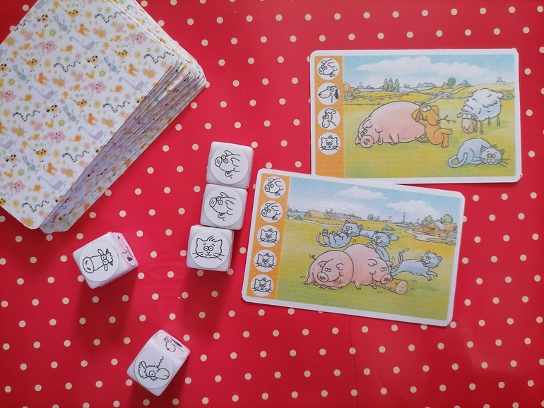 Корова и компания - свежая игра, сделана на днях. Состав и правила просты: есть 36 карт заданий с изображением животных от 2 до 5 в самых различных комбинациях, есть пять одинаковых кубиков с животными на всех гранях. Нужно открывать по по очереди карты заданий и за три броска кубиков собрать указанную в карте комбинацию. У нас это первая игра подобного рода. Я думала между Ямс от Джеко и этой, коровы показались веселей. Игра и вправду проходит весело, азартно и быстро: трясем в руках кости и уговариваем выпасть нужные грани. В обсуждениях игры на форуме бордгеймер есть придуманная участниками адаптация правил для взрослых, когда карт задании выкладывается сразу несколько, и игрок должен просчитать, какую из карт стремиться ему заполучить, что и положено в покер-подобных играх с костями. На будущее и на усложнение у нас лежит схожая игра Три поросёнка от Гага, а Парк развлечений от Хаба, пожалуй, пропустим.
