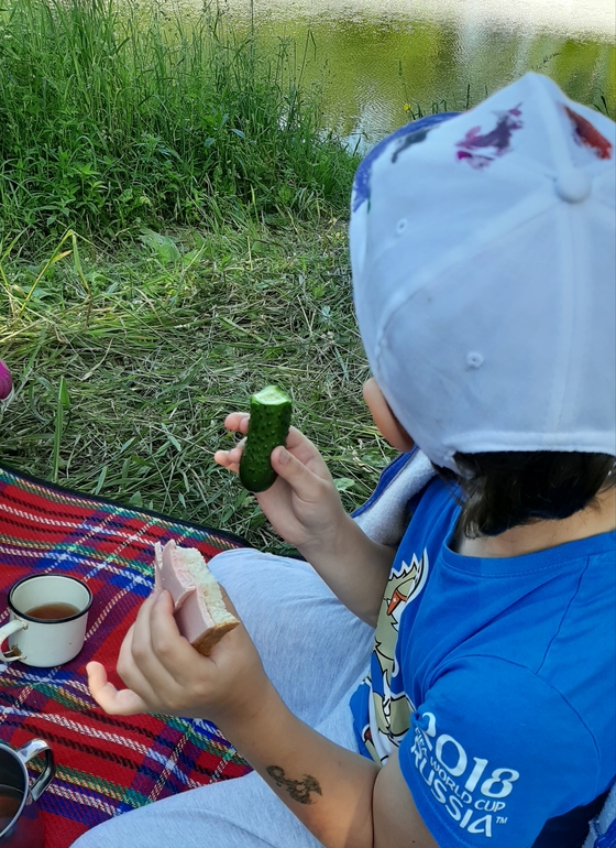 Ходили с детьми на пикник, с бутербродами, огурцами, кружками металлическими)