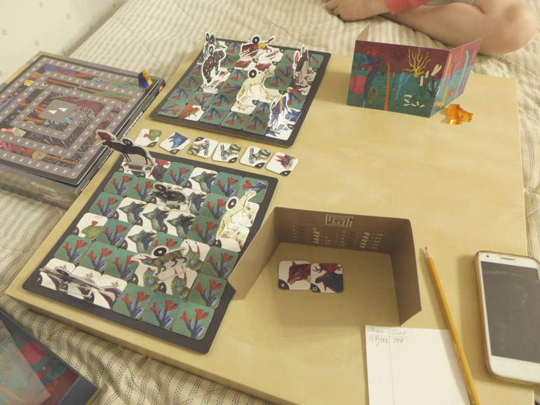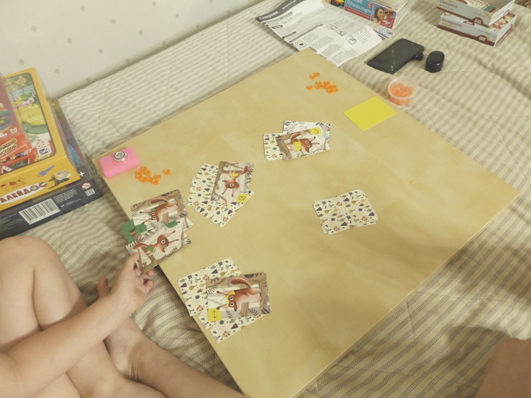 И я впервые услышала от дочки моментально после игры, когда я даже ещё не помышляла спросить её мнение - "Мама, мне игра очень понравилась!". Кажется я в тот момент возликовала в душе, и даже сделала кувырок от радости - приятно, когда рядом растёт такой компаньон. В эту игру дочь сама предлагает играть, пока у нас 4-5 партий (некоторые не снимала и первые не зафиксировала результат). В целом у неё получается, первые партии я продула)) Но то ли она всё-таки не допоняла всей сути (каких-то ньюансов), то ли отвлекалась, не была внимательна - последние партии были проиграны ею с сильным отставанием. Сегодня у нас даже из-за её ошибки слетела вся игра, уже практически в конце - доиграли, но не стали учитывать результат. Хотя у меня получилось вырваться на много очков вперёд за счёт большого загона с кабанами.