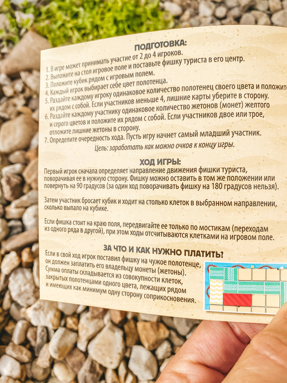 Смысл игры в том, чтобы выкладывать полотенца на пляж, перемещать фишку туриста, а если он останавливается на чужом полотенце, то ты платишь ренту). Все, как в оригинальном Марракеш. Правила я сравнила, они идентичны.