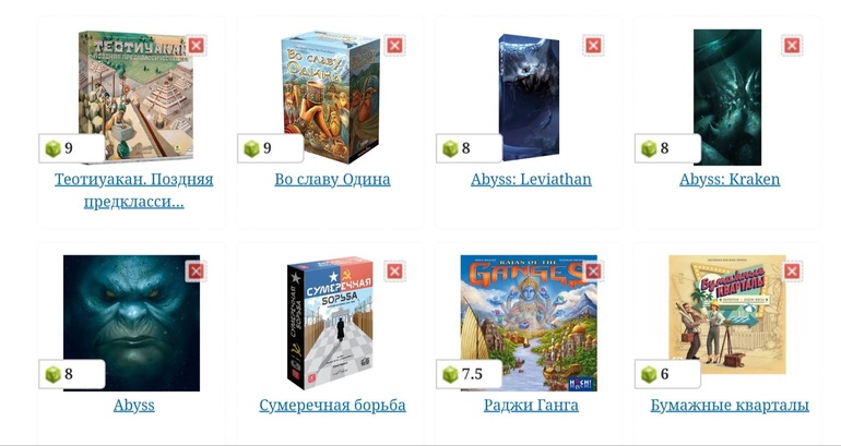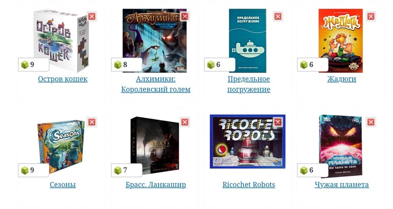 Брасс. Ланкашир. Ни один из Брассов меня не привлекал, но начавшаяся в настольном мире истерия подтолкнула попробовать. Не поняла столь высоких мест и непрекращающихся восторгов. Всегда одинаковое начало, не очень большое разнообразие, рандом в выходе карт. Все дружно ругают Крылья за то, что последние ходы тратятся на выкладывание яиц. Но почему то никто не ругает Брасс за то, что несколько последних ходов выкладываются ж/д пути туда, где больше очков. По мне так это одно и то же. Если доведётся, сыграю, но свою коробку продала без сожалений.