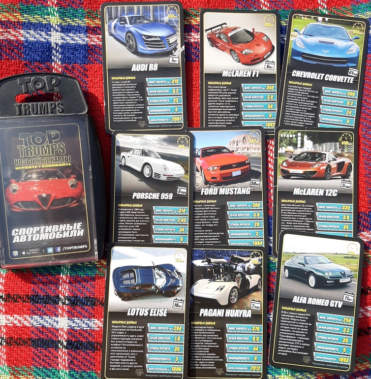 Надо ли говорить, карточки от машин сын таскает с 3 лет, игра и немного поинтереснее, потому как по сути Пьяница и подобные достаточно заунылые игры🙈 в автомобилям игроки по очереди определяют, по какому именно критерию из указанных на карточке будут мериться)