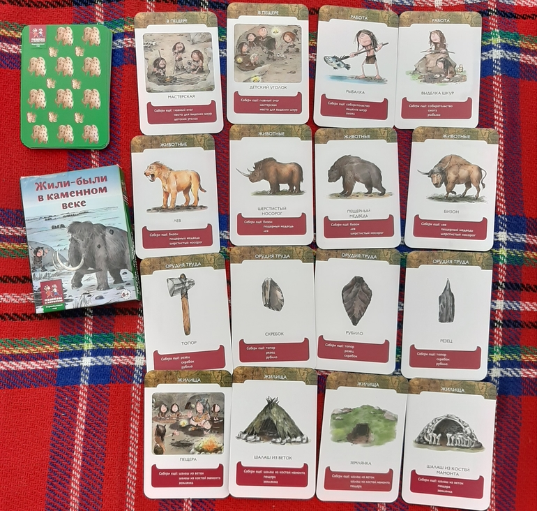 Следующая игра, Квартет или Семейка. Нужно собрать как можно больше серий из 4 карт. В процессе игры игроки по очереди спрашивают у соперников нужную им карту. Подобных игр у нас 3 вида, и все хороши по своему! Жили - были в каменном веке отличный способ поиграть и изучить тему Каменного века. Отличная познавательная игра!