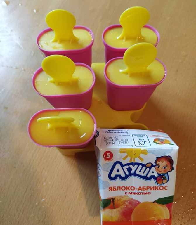 Там все просто, берешь сок или пюре в банке, разливает форму у нас Икея, ставишь в холодильник и получается мороженное. Также можно и сливочное попробовать взбить, но в это лето я не делала.