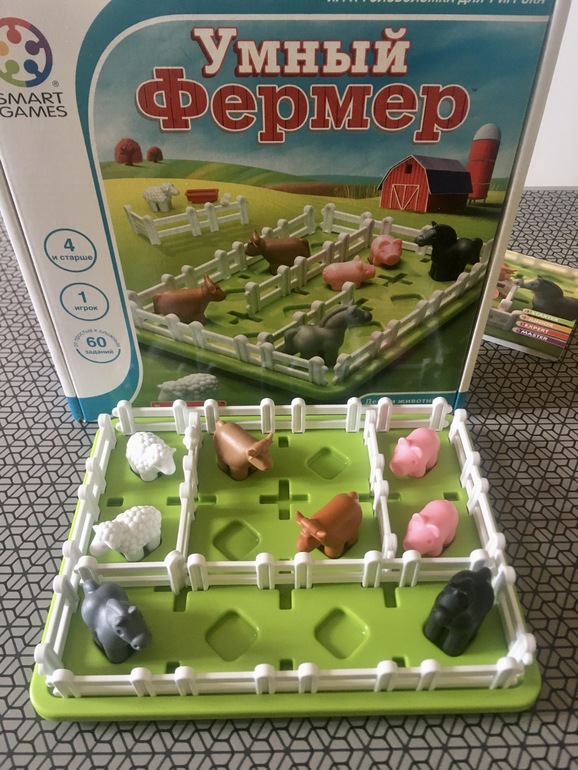 Почему-то была уверена, что рекомендованный возраст у этой головоломки 5+, а на коробке указано 4+. Но, не смотря на столь малышковые рекомендации, решения даются не легко. Вчера вечером дочка сразу распаковала коробку и приступила к задачкам. Оформление покорило нашу девочку. Резиновые животные, забор с птичкой- все эти детали восхищали. Всё обращало на себя взор: и хвостики крючком у поросят, и вымя у коров, и колечки шерсти у овец , и длинноногие лошади. Дочка сказала, что Умный фермер теперь станет самой любимой её головоломкой.