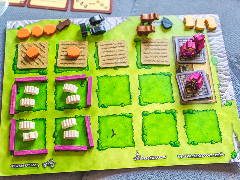 У меня вышло 33 очка за счёт того, что я собрала и всех животных, и все растения, вырастила максимум тыкв, которые дают больше всего очков. Комнаты у меня тоже были каменные, а по количеству жителей мы с мужем сравнялись к концу игры. Но я видела, что муж не помнил всех этих нюансов и скорее всего поэтому проиграл. Я то хоть что-то запомнила с прошлых игр, пусть у меня не все получалось, но все равно я смогла победить за счёт того, что чаще играла.