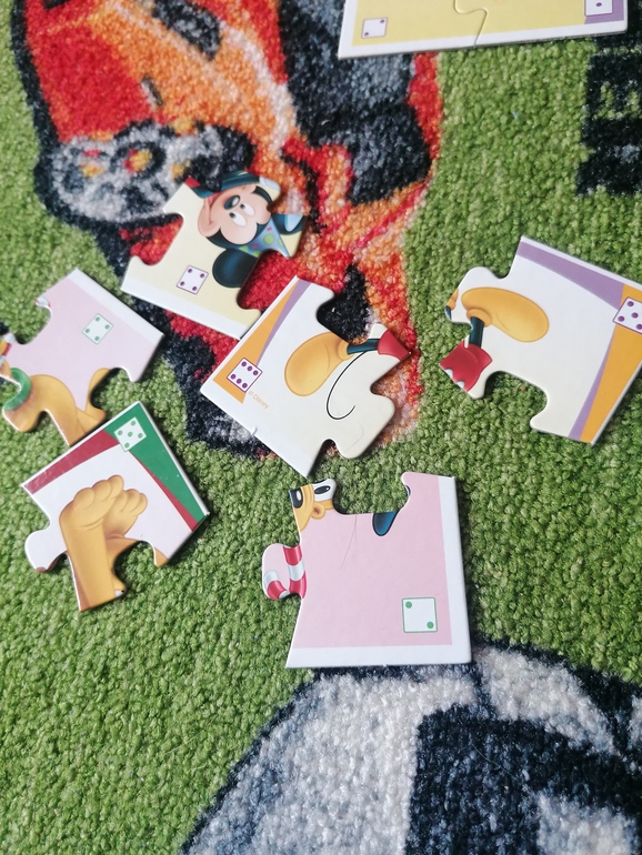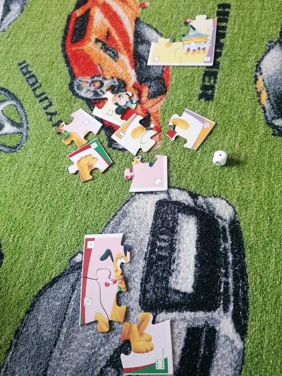 Производитель предлагает переворачивать картинки, и при броске кубика искать свою с нужным количеством точек. Но так игра усложняется и затягивается. Анастасия как-то с пиратами показывала детский вариант сборки, т. е. кинул кубик и взял свой кусочек пазла. Кто первый собрал, тот и выиграл.