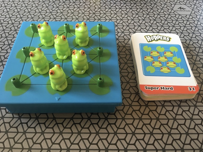 К минусам, кроме отсутствия предупреждения о том, что решение на обороте не единственный возможный вариант, отнесу то, что очень легко, кмк, прыгнуть лягушкой неправильно и не заметить этого. Т.е. дошкольника при решении этой головоломки скорее всего надо контролировать.