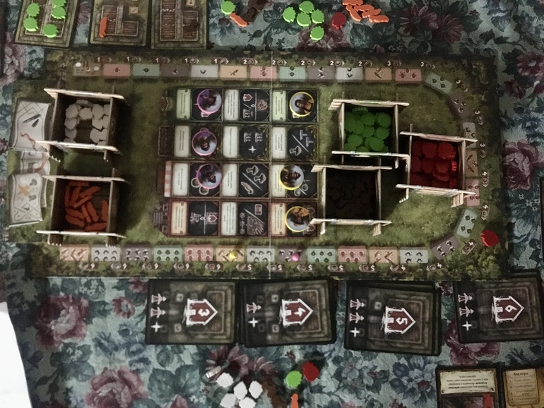 Половину партии дочка шла впереди меня и уже потирала ручонки в предвкушении победы, но в шестом раунде я вырвалась вперёд. Плюс использовала возможность передвинуться на два стола по ходу движения, сбросив карты теплиц. Так что я добралась до 5 морковок, а дочка до 5 грибов, отстав на два стола. Ещё ни разу дочке не удалось победить, хотя играет она не плохо. Вчера наконец-то заинтересовалась специальными картами, а также её осенило, что можно в самом конце сбрасывать карты теплиц и передвигаться по столам, хотя я делала это регулярно. Теперь интересно, как пройдёт сегодняшняя партия.